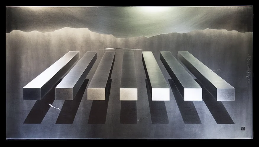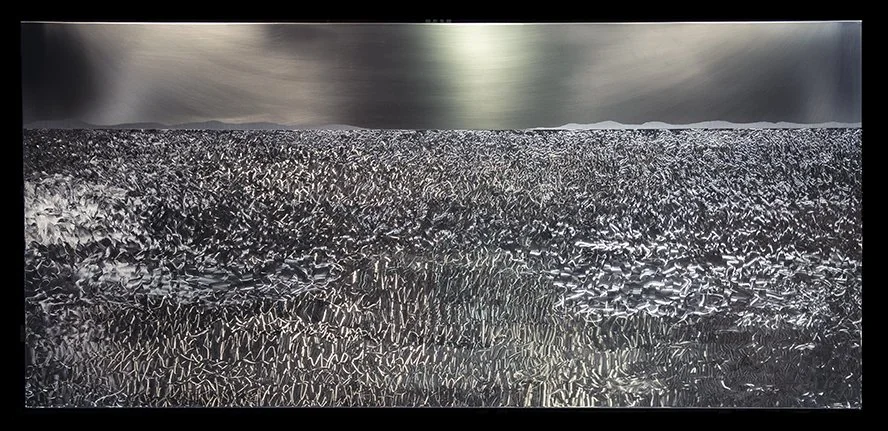 These panels are an ongoing exploration of mine started in 2000 of the optical properties of abraded metal. I have been doing metalwork for forty years and along the way recognized that some tools leave a surface that seems to recede from the viewer, some simply flatten or create no dimensionality, and some seem to lift off the surface into the foreground. By combining these on a surface I can create holographic effects of depth and space with a two-dimensional object. These panels of stainless steel are ultimately the purest expression of this vision—light pushed to create dynamic space. They are fundamentally objects to create a feeling in the viewer.